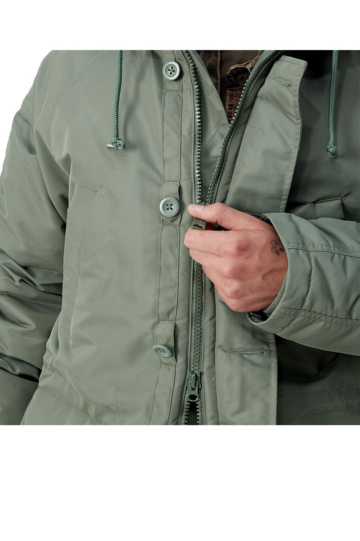 The 'Olten' Hooded Parka is made from lightweight nylon twill. It is water-repellent and lined with nylon taffeta. This model features an adjustable fleece-lined hood and a detachable fleece trim at the waist and hem. Two welt pockets at the chest, two buttoned flap pockets on the lower half of the parka, a zipped pocket on the left sleeve and the Flag Label complete the design.